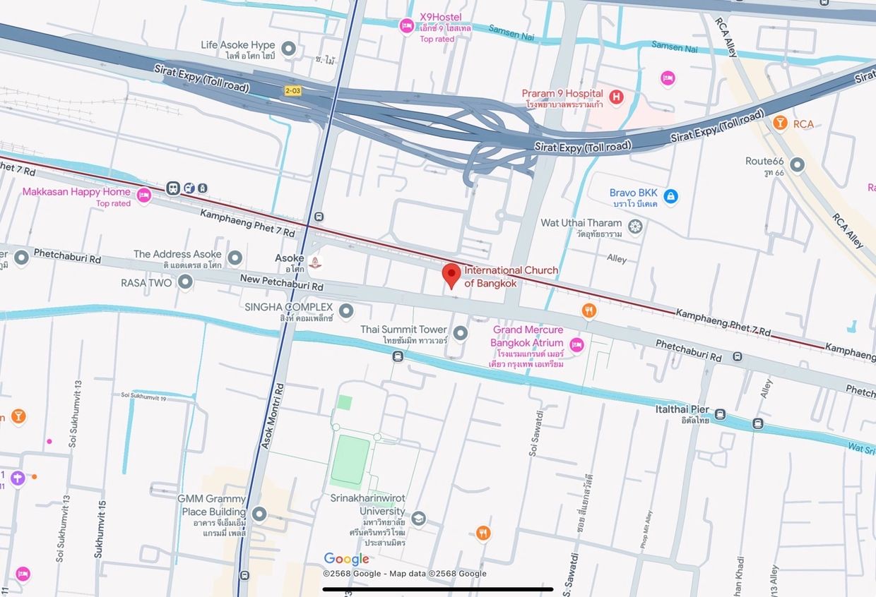 Sunday Worship Address: Morning Service: Located inside Lancaster Hotel, 1777 ถ. เพชรบุรี แขวงบางกะปิ เขตห้วยขวาง กรุงเทพมหานคร 10310/ Evening Service: Bangkok Christian GuestHouse ตำบล สีลม, อำเภอ 123 Soi Sathon 2, Bang Rak, Bangkok 10500